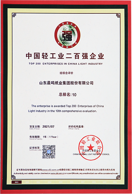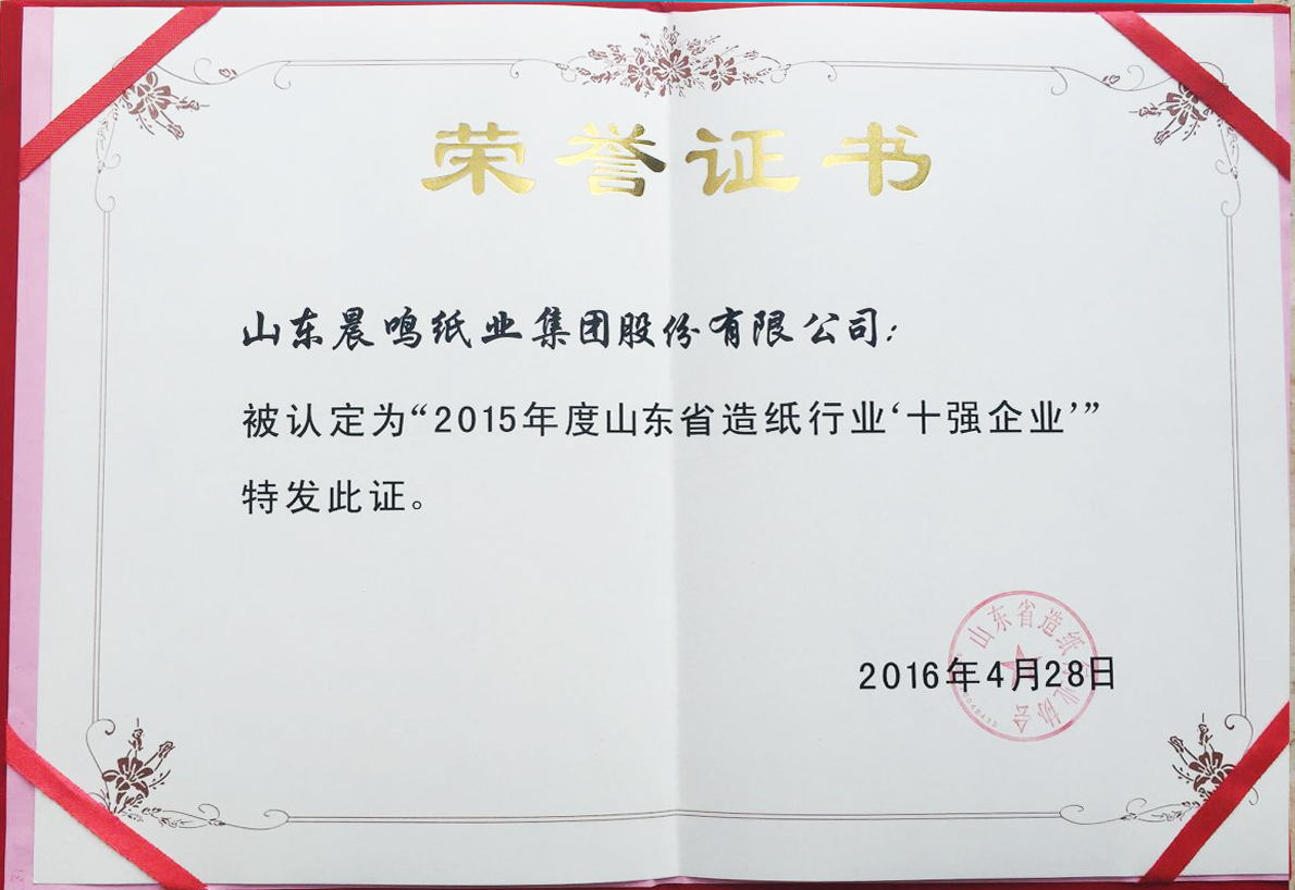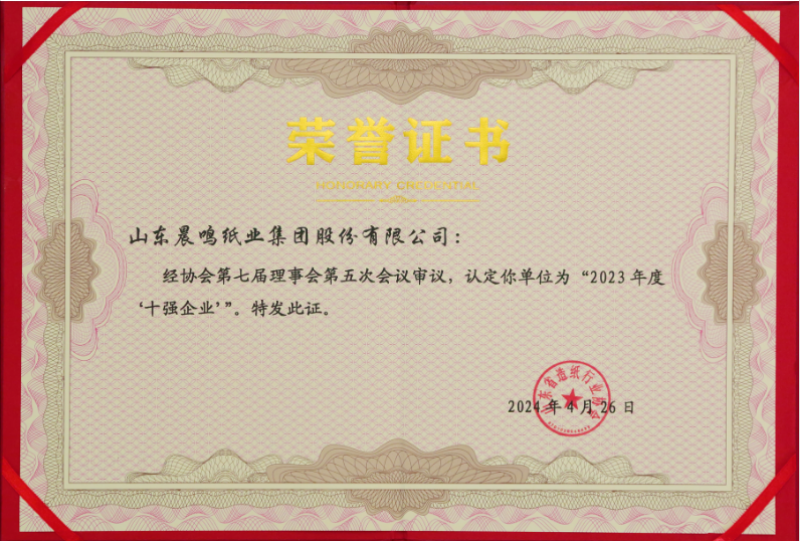 2013/5/28 中國造紙協會第三屆理事會第五次擴大會議在武漢召開,會上公布了由中國輕工業聯合會 ,中國造紙協會評選的2012年度“中國輕工業造紙業十強企業”榜單,晨鳴位列其中。